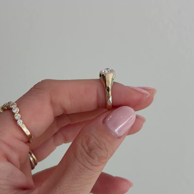 The Aurum Signet Ring is cast in solid 14k gold and crowned with an oval-cut diamond or gemstone, encased in our signature molten bezel setting. The organic contours soften the bold geometry of a traditional signet, creating a piece that feels both powerful and fluid.