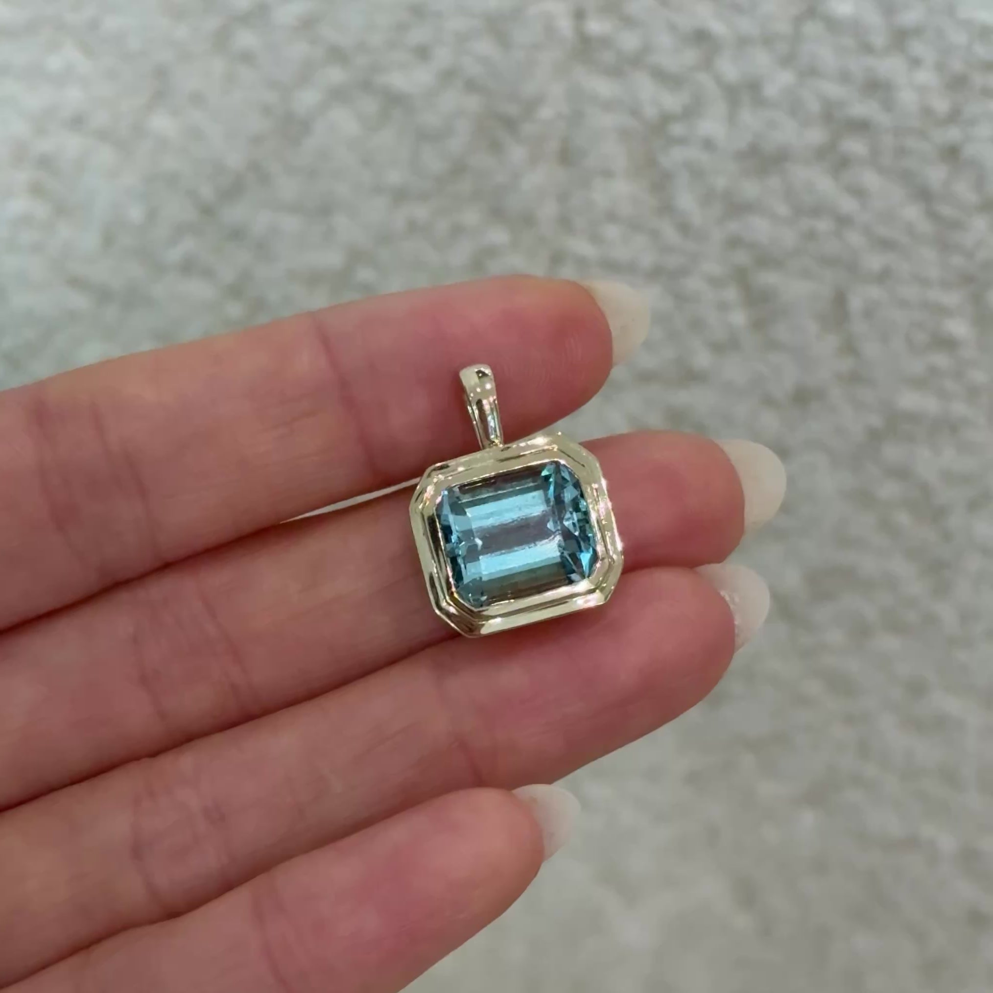 The Helios Pendant features a bold emerald-cut, natural aquamarine encased in a double bezel of solid 14k yellow gold. A symbol of structure and protection, the bezel frames the stone like rays around the sun. The tapered bail allows it to rest effortlessly on a chain or collar, while the clean lines highlight the stone’s symmetry and depth, creating a look of strength and luminous clarity.