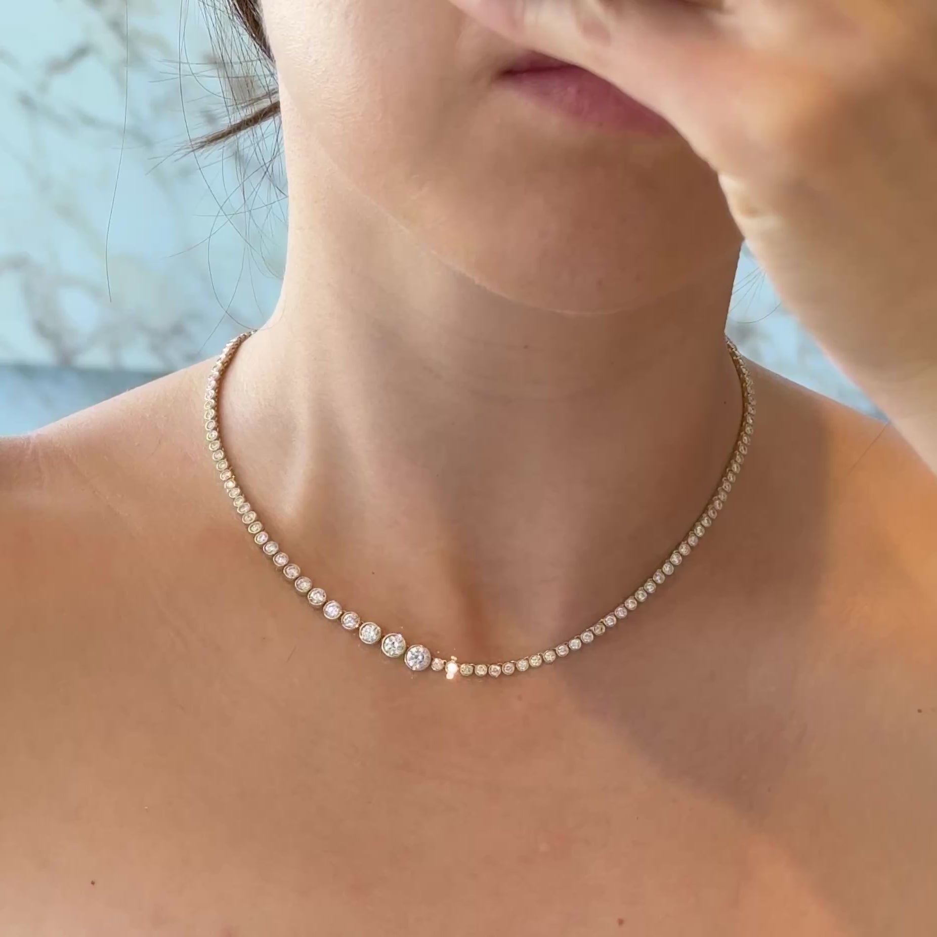 The ORBIT Necklace is a statement of movement and light. This unique design features graduated bezel-set diamonds, arranged with asymmetrical rhythm for a look that’s unexpected yet refined. Crafted in solid 14k gold, the flowing silhouette catches light from every angle, creating brilliance in motion.