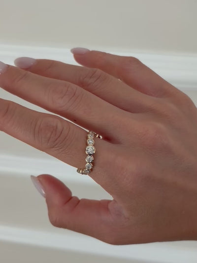 The Orbit Ring is a study in movement and light. Bezel-set diamonds trace the band in a graduated rhythm, creating a sculptural form that feels both effortless and refined.